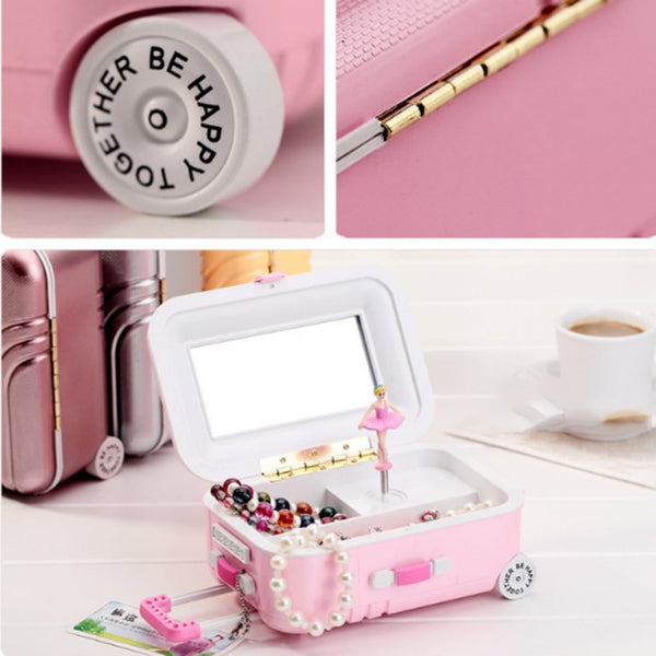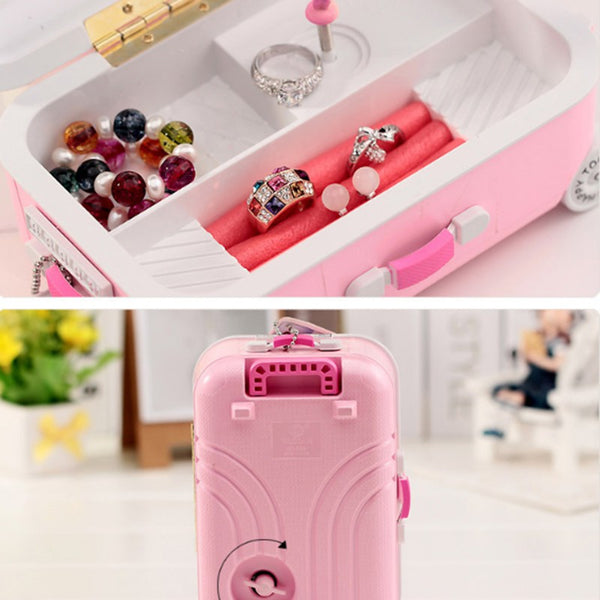 This Suitcase Jewelry Music Box is fashionable and cute. The draw-bar suitcase design makes it convenient to carry the music box anywhere. It is made from superior synthetic resin, the music box is soft and durable, keeping jewelry collection safe.